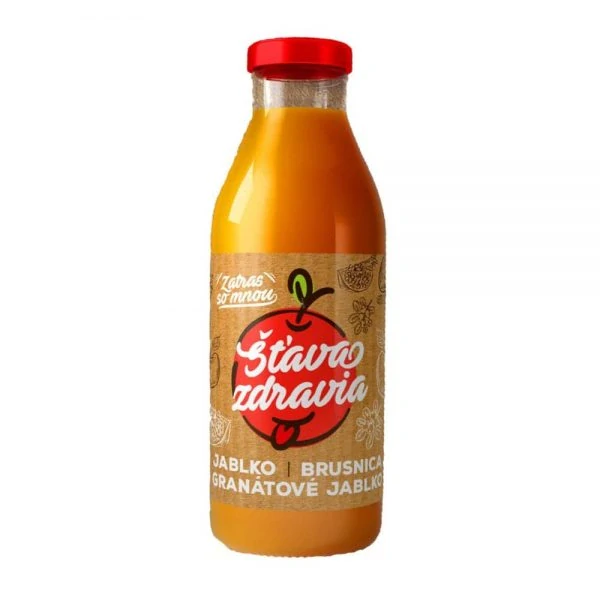 Čistá jablková šťava s prídavkom brusníc a granátového jablka obohatená o prírodný Vitamín C.